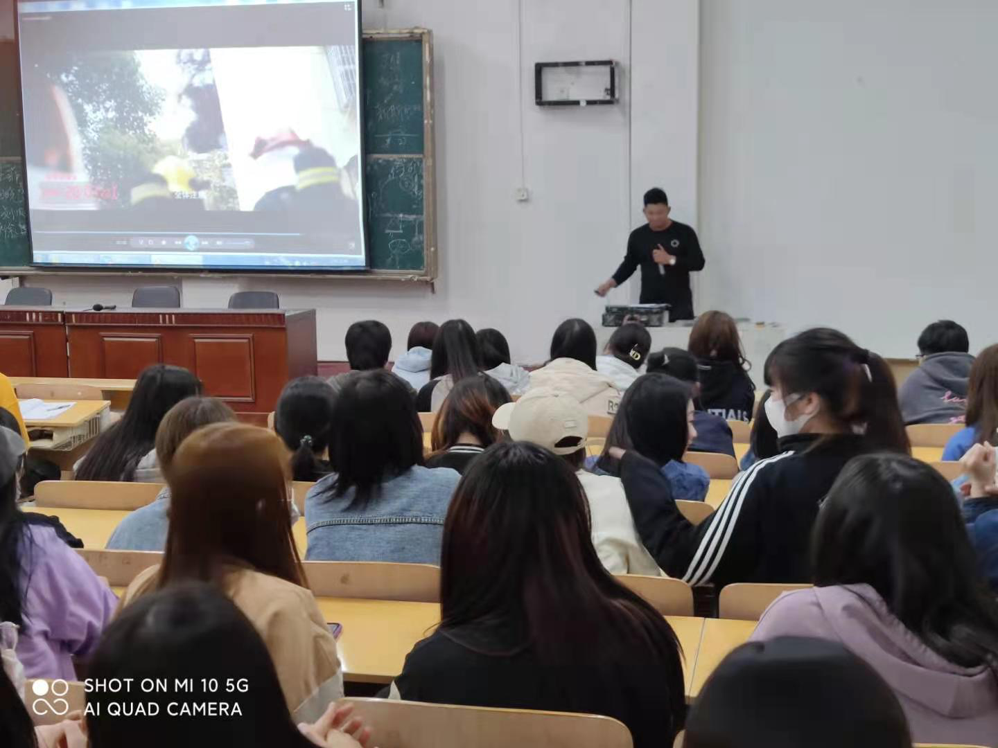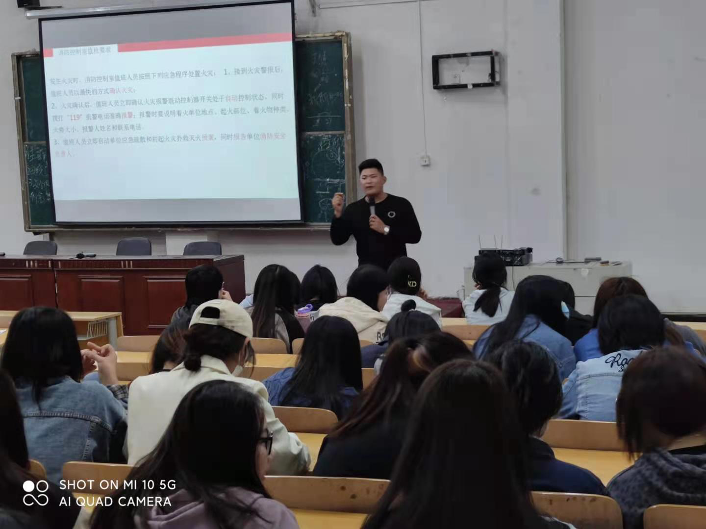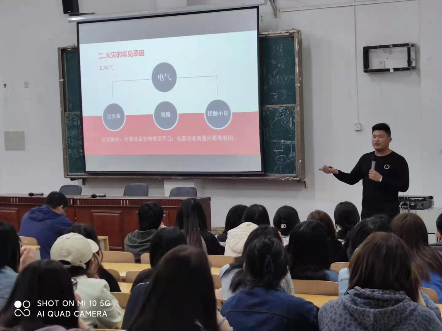 随后,杜老师又给大家讲了常见火灾隐患及排查,比如线路老化,私挂乱接、易燃物品随意堆放、阻塞疏散通道、阻塞消防车通道、电动车随意停放、消防设施损坏等等,并教大家发生火灾如何报警,如何疏散、逃生。他提醒同学们要加强注意,规避隐患。加强了同学们对火灾隐患的认识。