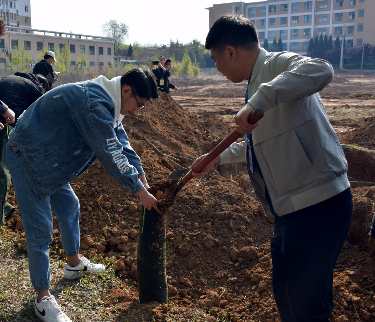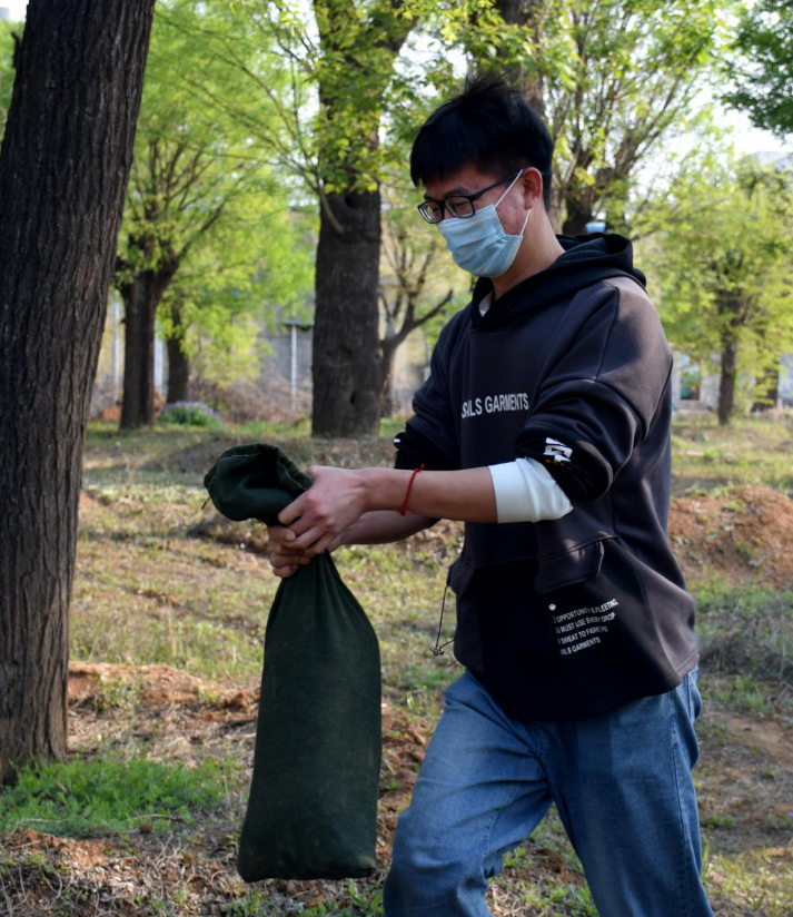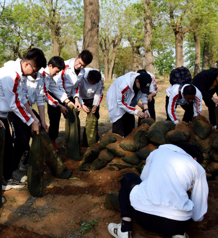 在工作人员的认真指导下,活动正式开始。学生及老师共分为四队,每个人分工明确,装沙、运沙、组装防汛墙等工作都在飞速进行着。同学们都不惧劳累还有土尘的影响,他们装满每一个沙袋,中途无休息的运输着。