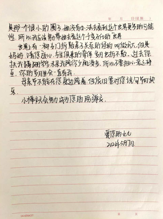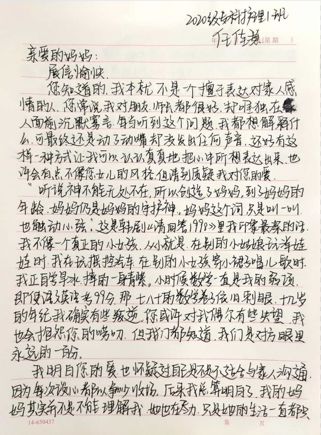 来自2020级专科护理1班的任佳慧,在信中说出了我们这代人与父母出现的隔阂与矛盾,青春期的我们叛逆、不懂事,但母亲丝毫没和我们计较,一直陪伴我们,为我们磨去棱角。任佳慧在信中这样说:“这个世界千变万化,妈妈只是不适应,我们应该带她去看看。”