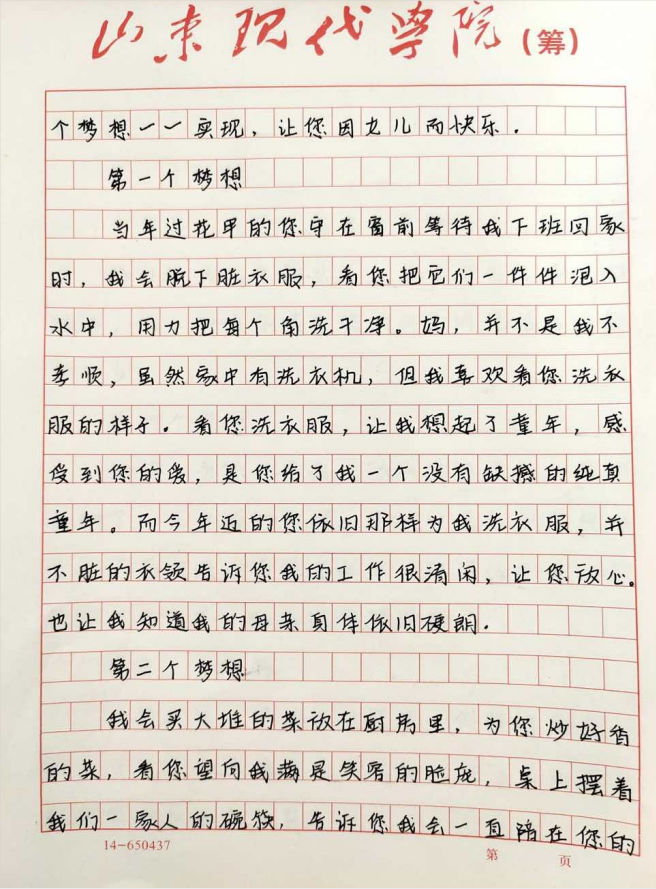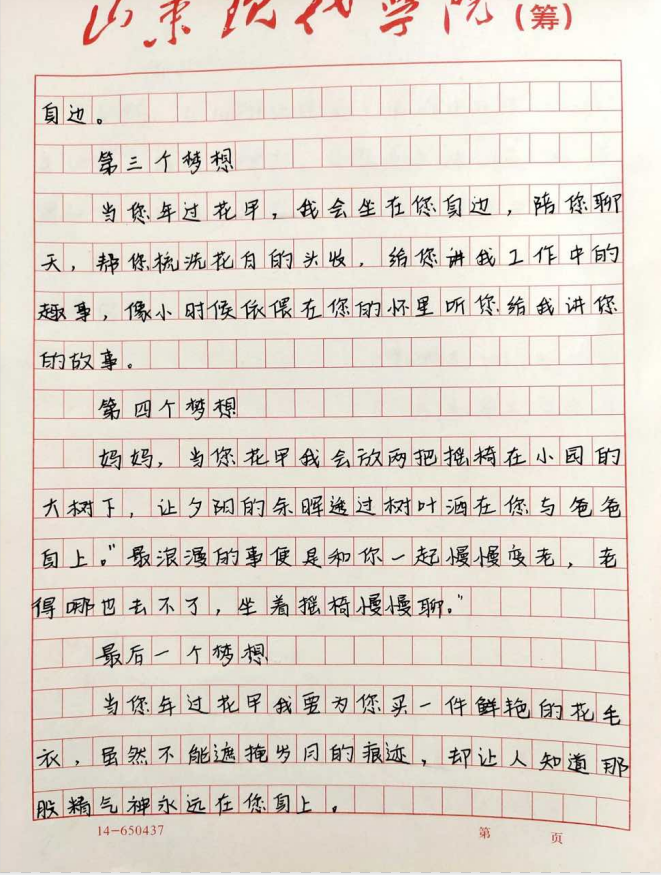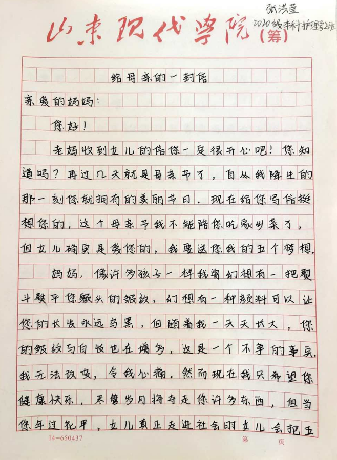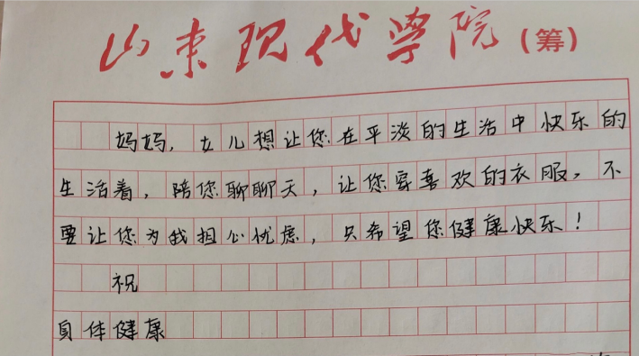 2020级本科护理学2班的张洪莹在信中对母亲许出了五个愿望,为妈妈洗衣服、给妈妈做美味佳肴、陪妈妈变老看夕阳…不管妈妈多大,在我们心中都是最美的。