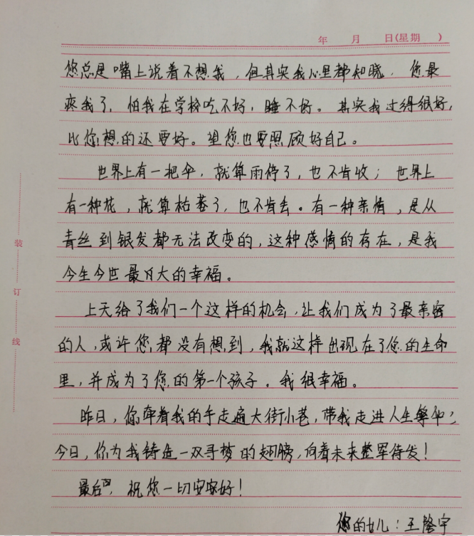 岁月不居,时节如流,2020级本科护理4班的王隆宇也用书信的形式表达了自己内心对母亲深深的爱,虽然我不曾说过我爱你,但在我心中你一直是我最爱的人和这个世界上最美的妈妈。