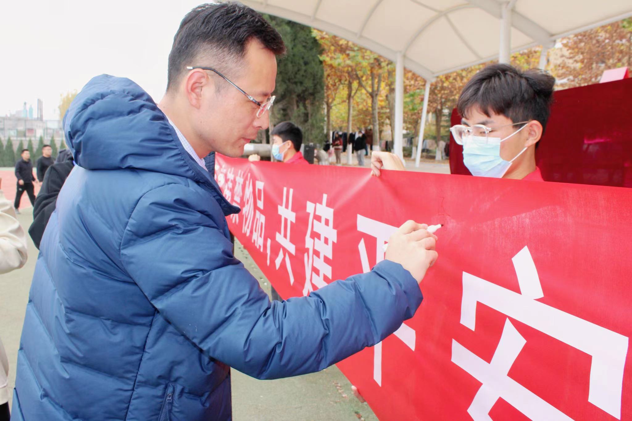 最后房昌盛院长进行总结发言,同学们,生命诚可贵,安全责任大。请从自我做起,从一言一行做起,提高安全意识,杜绝一切危险隐患,大家共同营造一个安全和谐的生活和学习环境。领导、学管人员、同学们有序地在横幅上进行签名,签下一个名字,守住一份诺言。