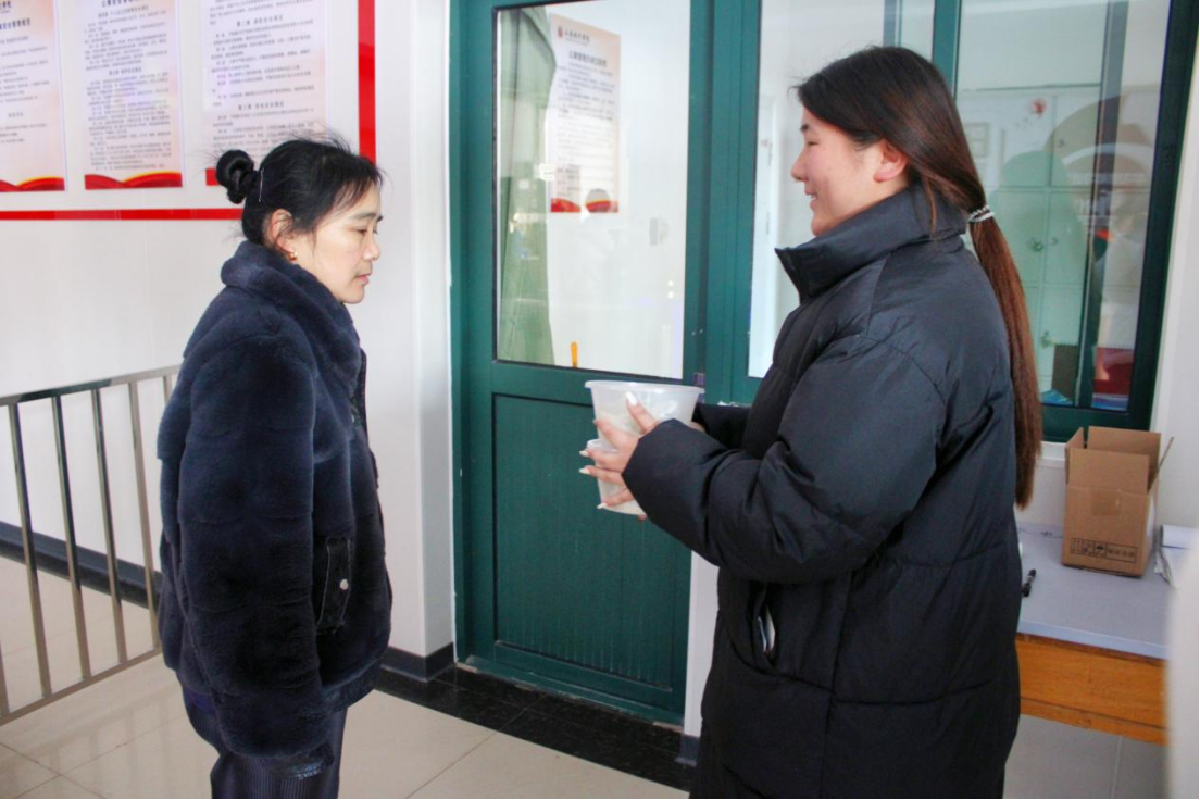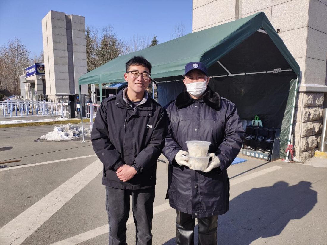 同学们把热气腾腾的饺子分装好,送至学校宿管阿姨、保安大爷手中。让他们在寒冬中收获了温暖。一枚小小的饺子,传递着师生浓浓的爱心。