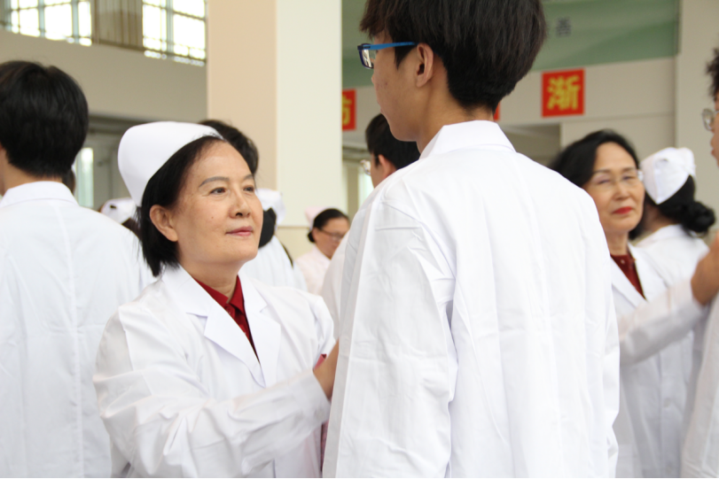 护理学院教师们为全体成员整理衣冠,规范护理工作者的职业形象。