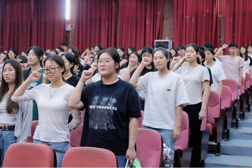 全体学生在学生代表孙溪的带领下进行庄严宣誓。他们高举右手,铿锵有力地宣读誓言,彰显出同学们对诚信考试的坚定信念。