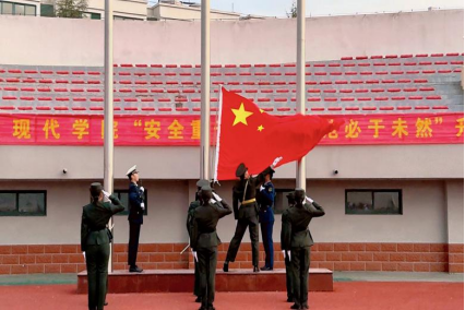 随着激昂的《义勇军进行曲》奏响,国旗护卫队迈着整齐有力的步伐,护送着五星红旗走向升旗台。在全体师生的庄严注目下,五星红旗冉冉升起,迎风飘扬。