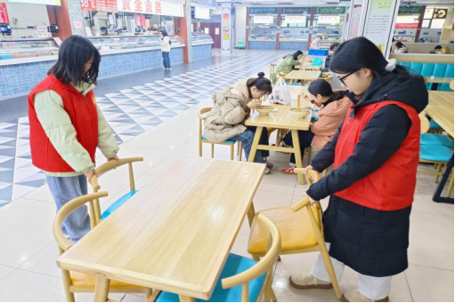 活动当天,同学们身着红色志愿马甲,配合餐厅工作人员进行着擦拭桌面、摆放桌椅、清扫垃圾等工作。他们首先回收餐具、收垃圾,放到指定位置后洗净抹布擦桌面,随后开始摆放桌椅,扔掉垃圾,最后进行拖地。整个过程有条不紊,展现出了出色的团队协作能力。