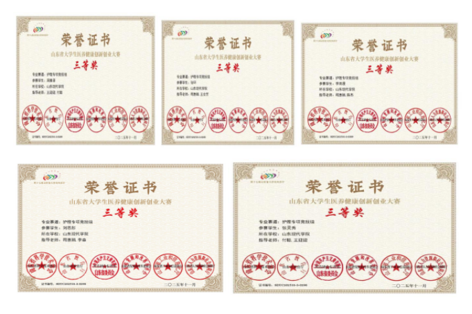 近日,2025年山东省大学生医养健康创新创业大赛-护理专项竞技赛道在曲阜圆满落幕。我院精心选拔的5名参赛学生张环、李雨漫、刘思彤、周雅菲、张灵秀,在指导教师团队的悉心指导下,凭借扎实的专业知识、规范的操作技能和良好的临场表现,均荣获大赛三等奖,充分展现了我院护理专业教育的扎实成效和学子们的青春风采。